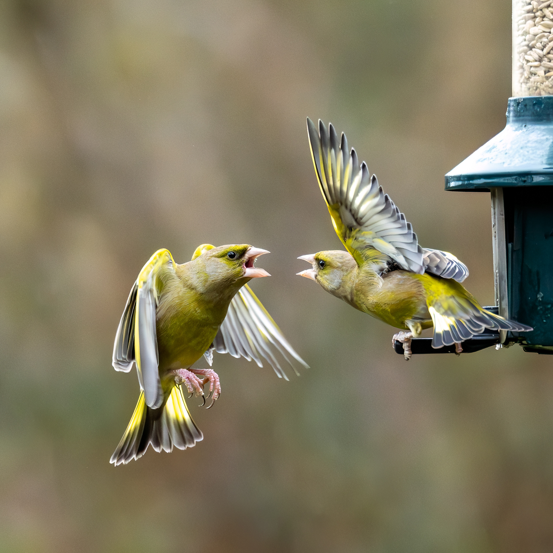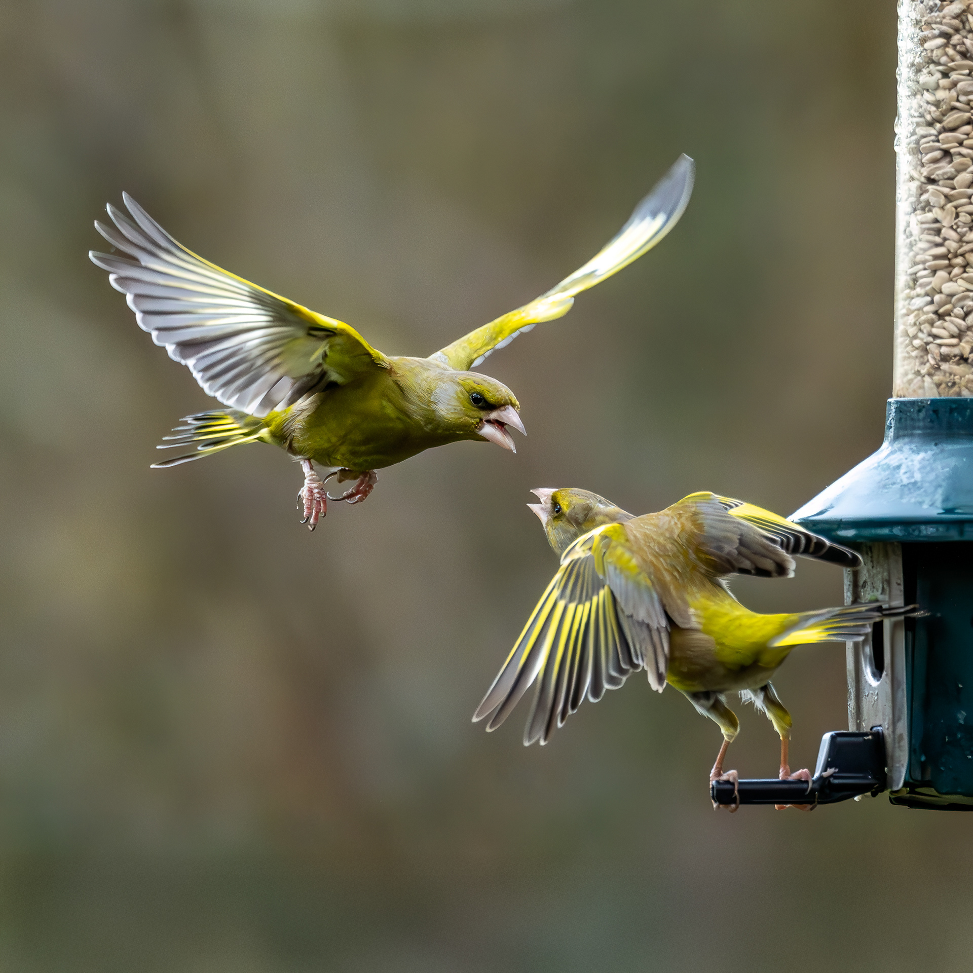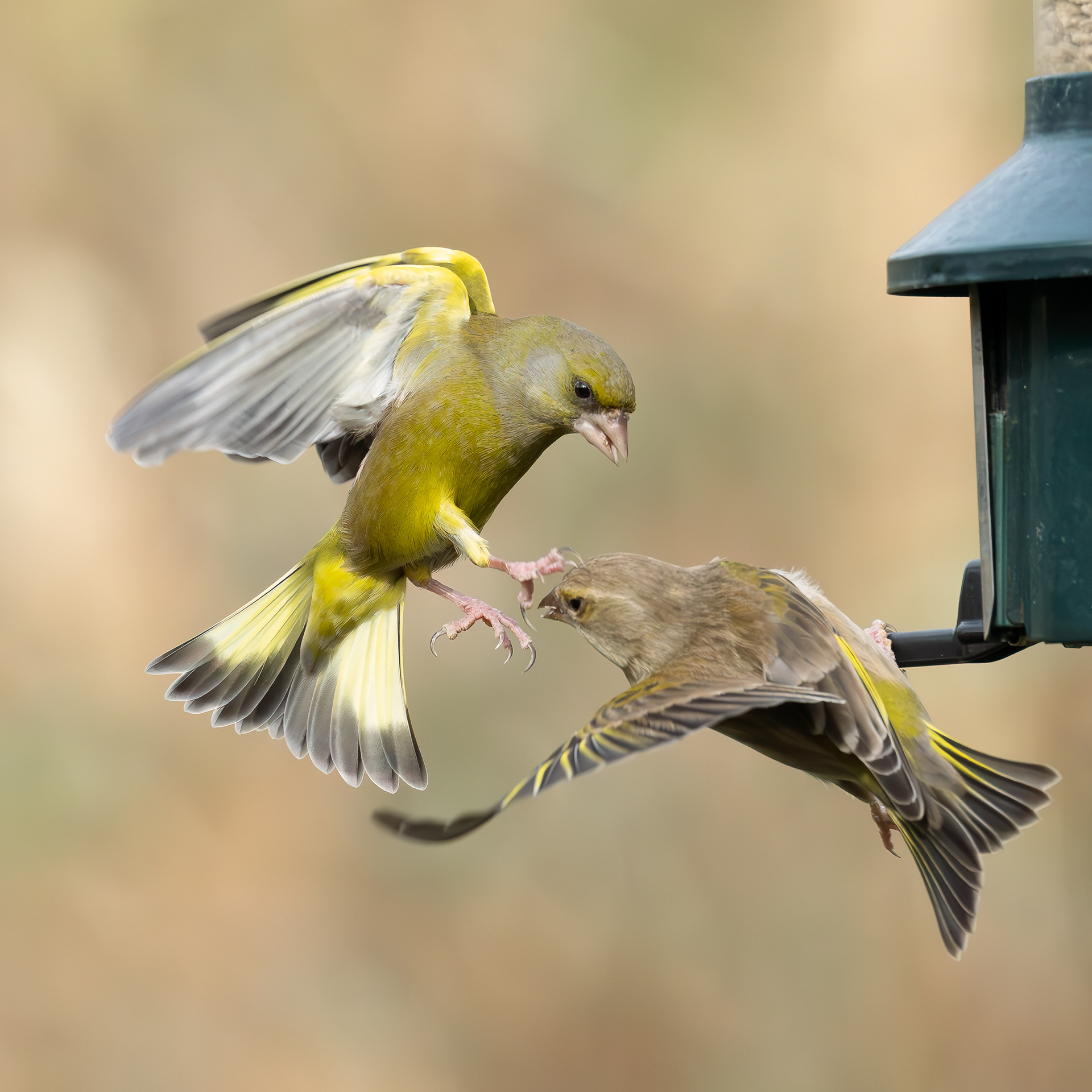 Whilst most wild garden birds are happy to wait their turn at the feeder station, Greenfinches are voracious feeders and will do whatever they can to dislodge any incumbent, so long as their opponent is not larger than they are: I've never seen them tackle a woodpecker.