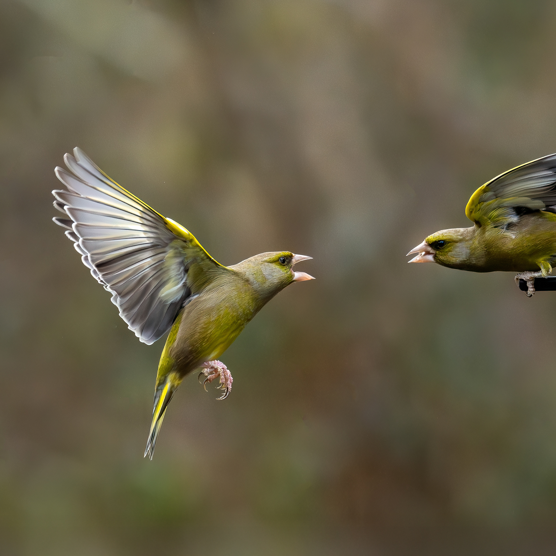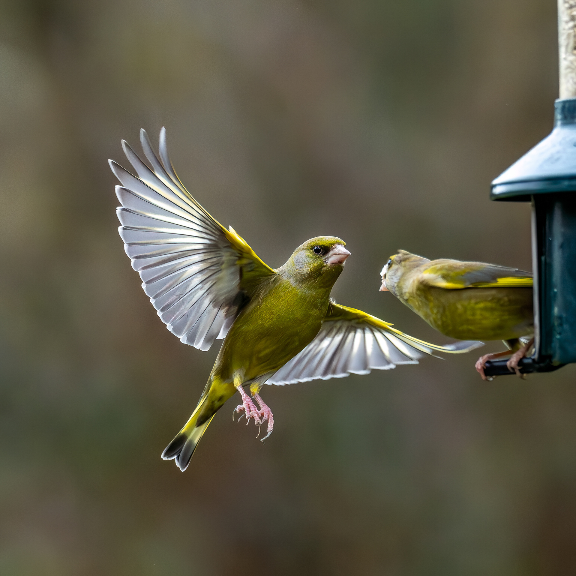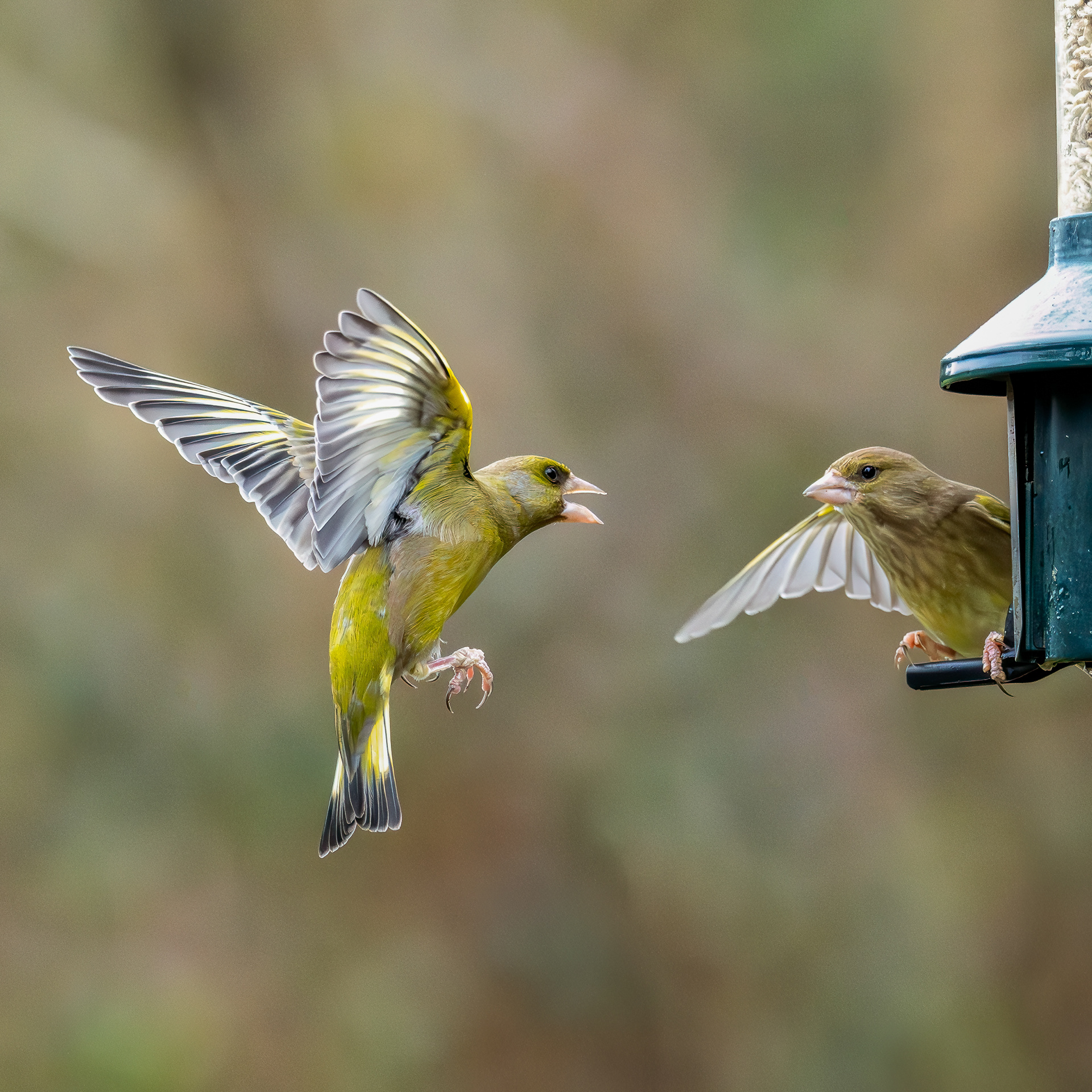 Whilst most wild garden birds are happy to wait their turn at the feeder station, Greenfinches are voracious feeders and will do whatever they can to dislodge any incumbent, so long as their opponent is not larger than they are: I've never seen them tackle a woodpecker.