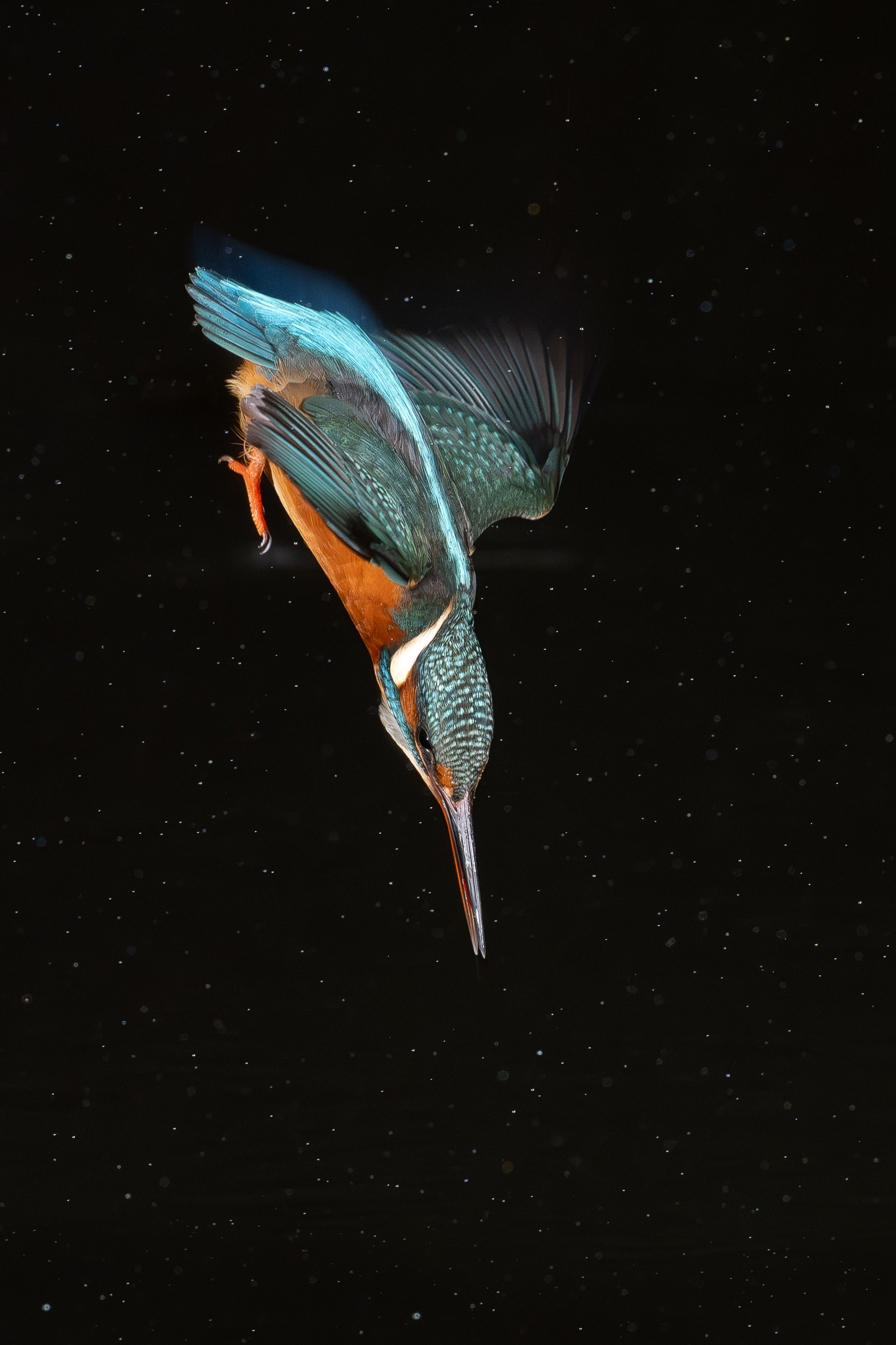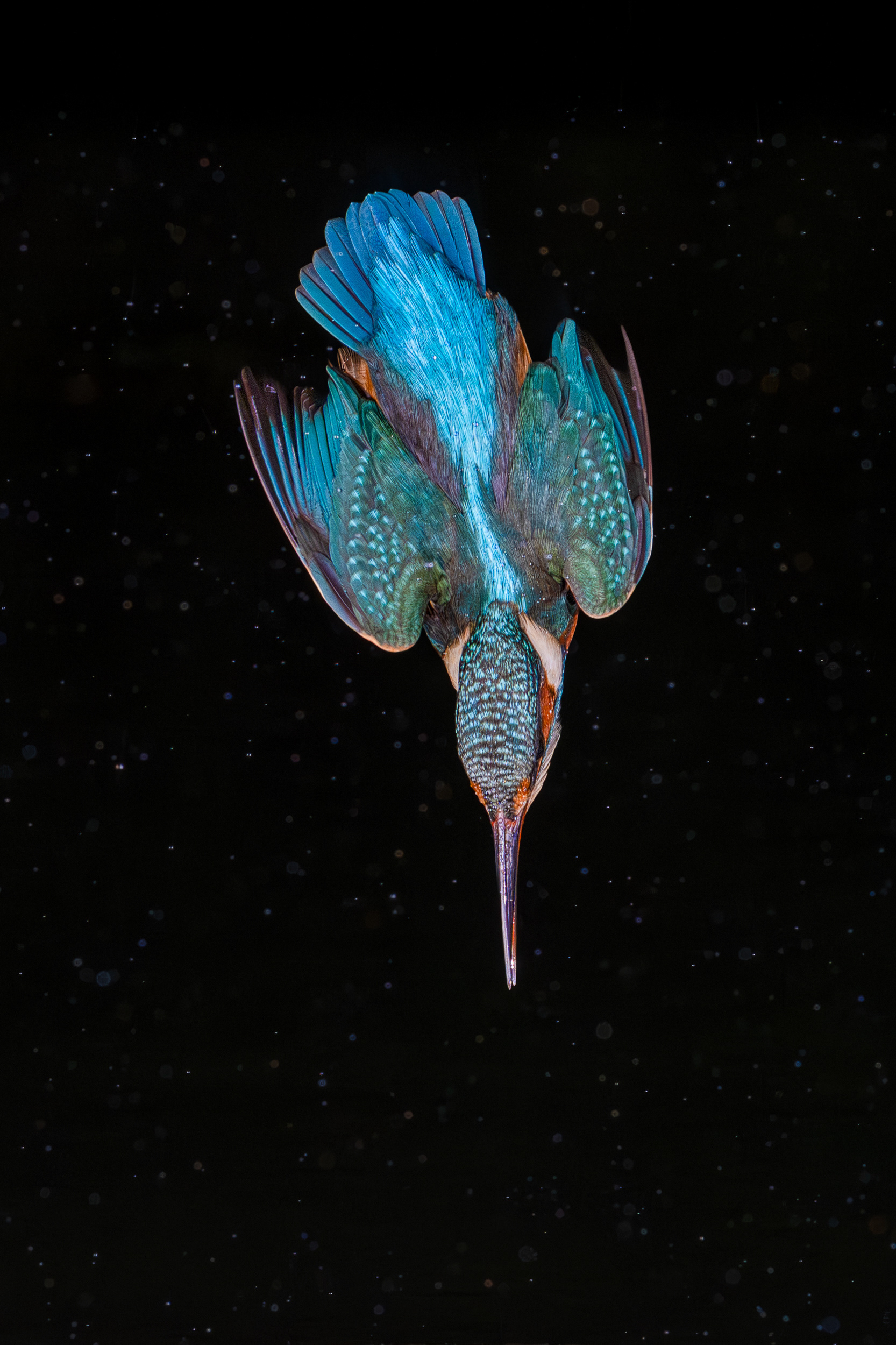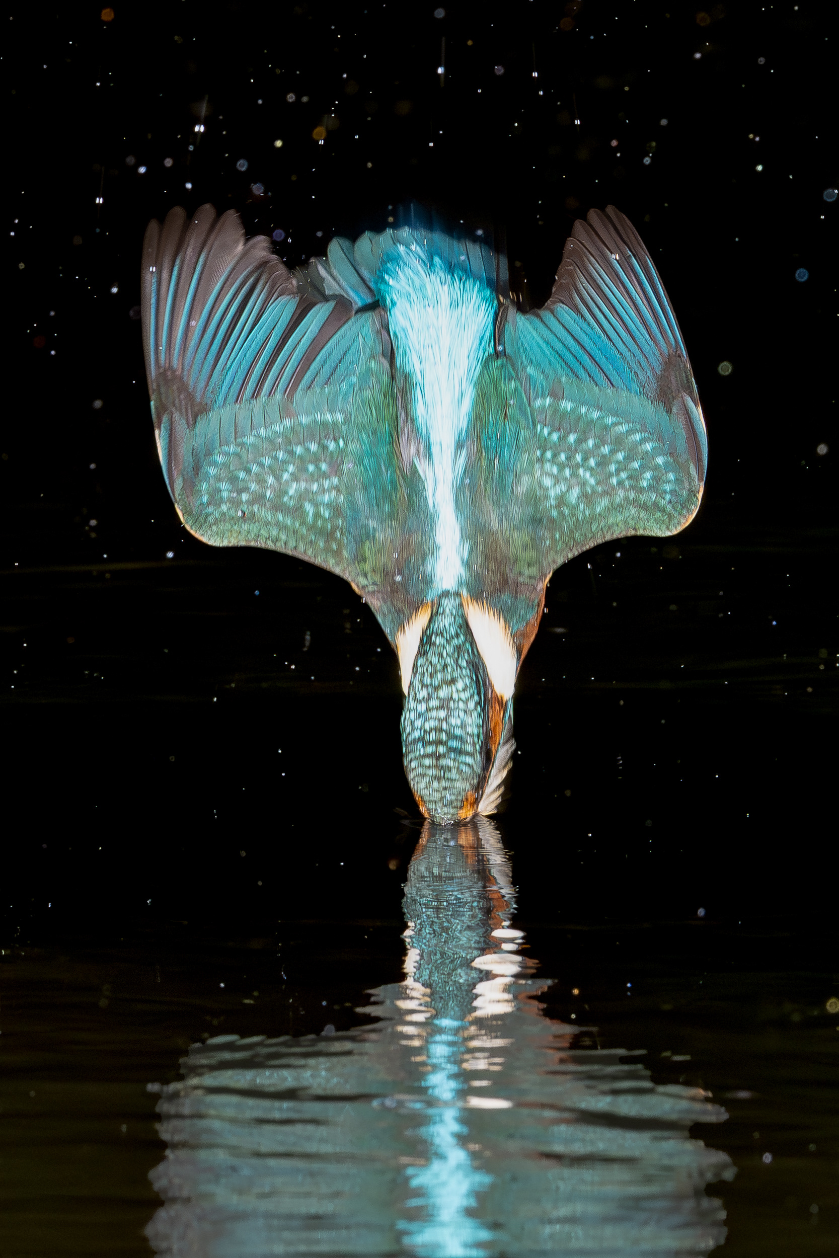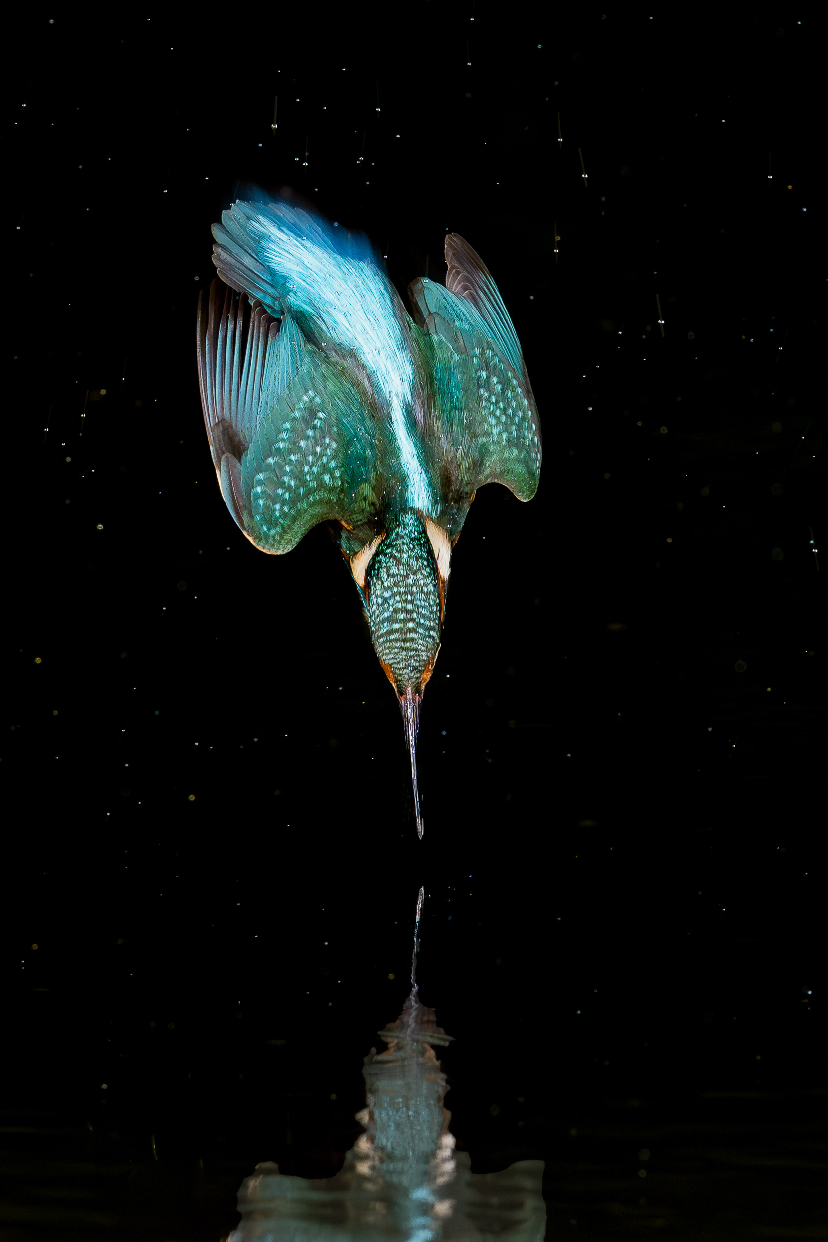 These images of Kingfishers were taken at Pete Whieldon's "Otterbourne Hides and Studio". Although they have the appearance of being taken at night, the background is dark because they were taken with flash as the only light source. The bright speckles in the images are raindrops.