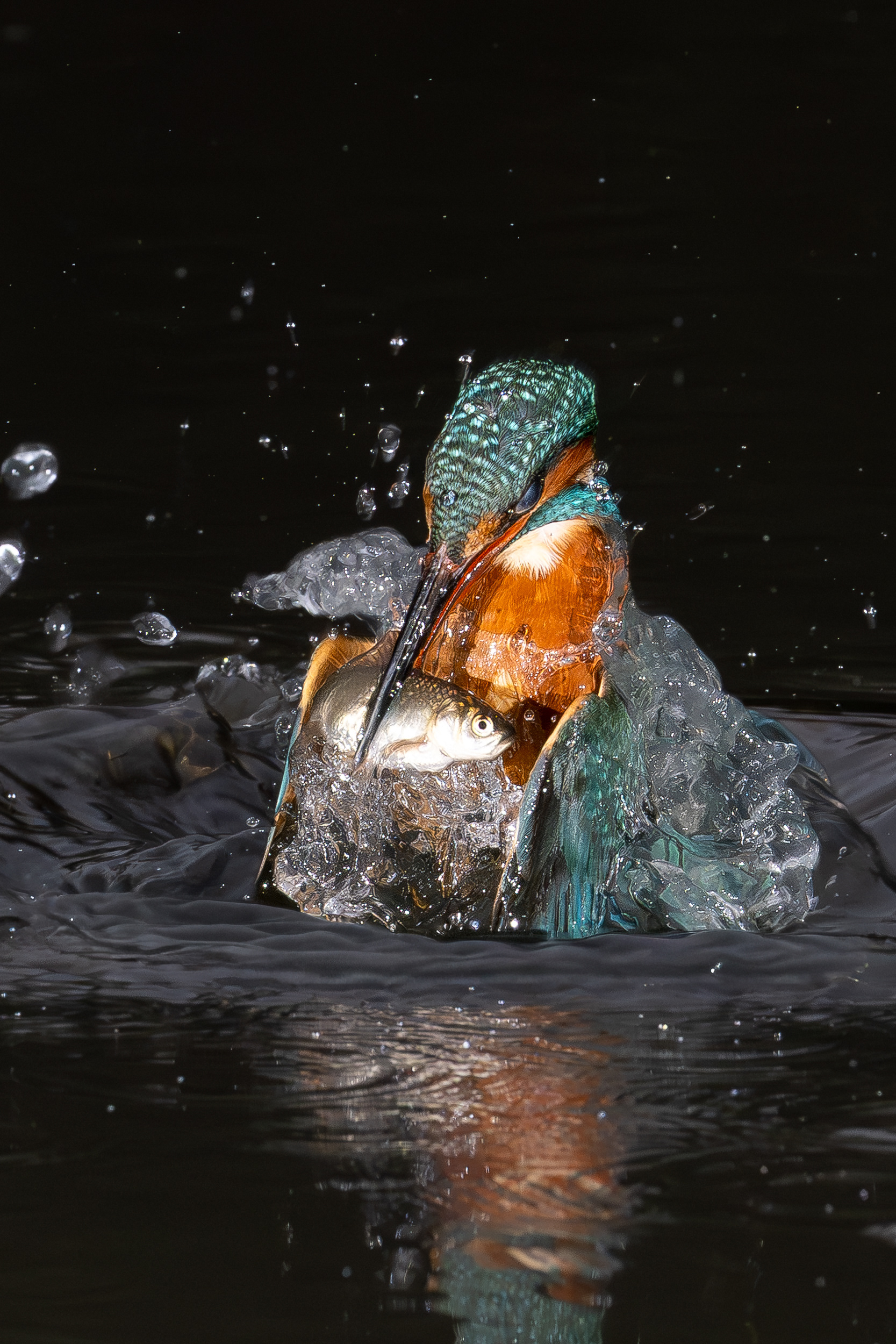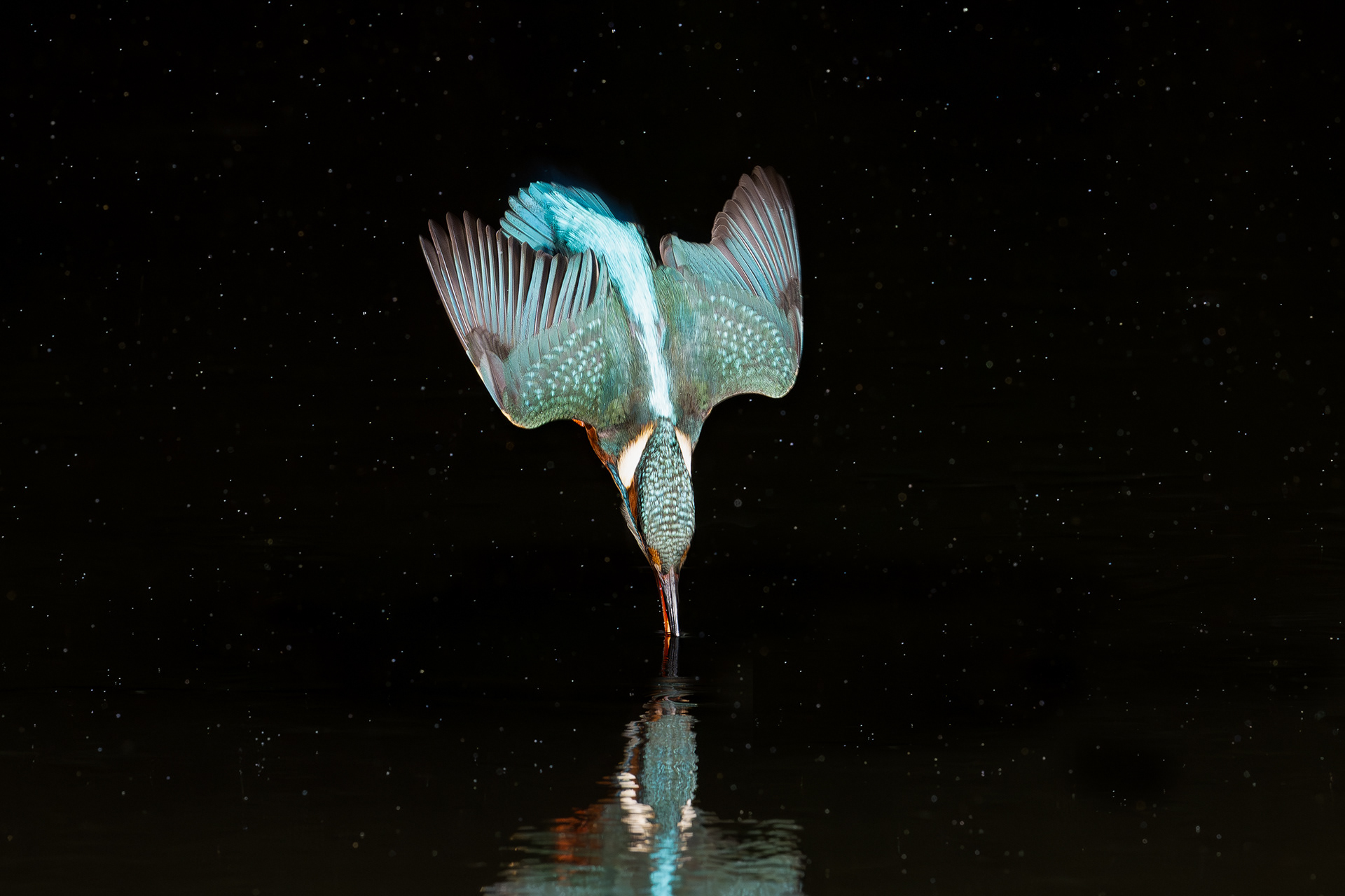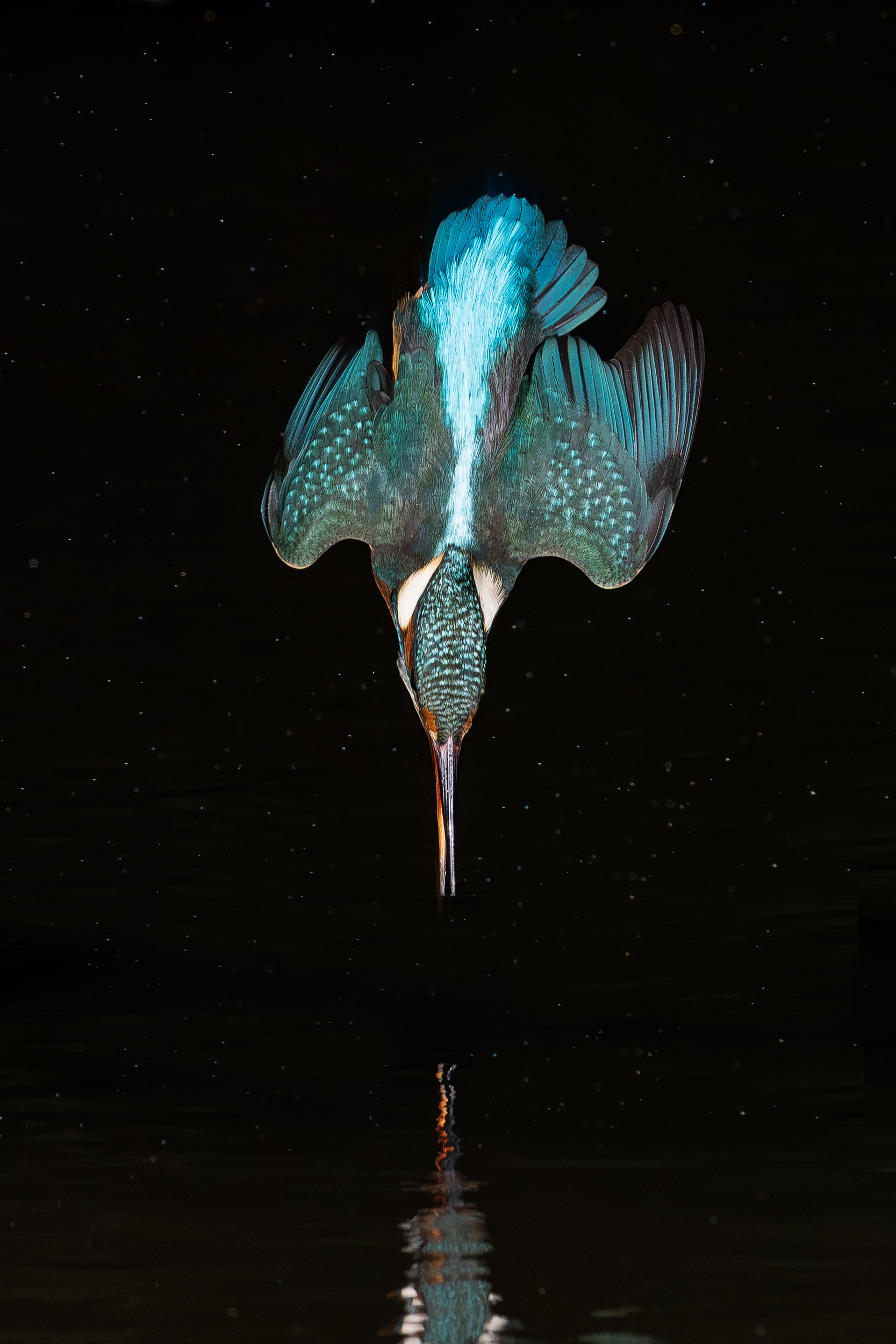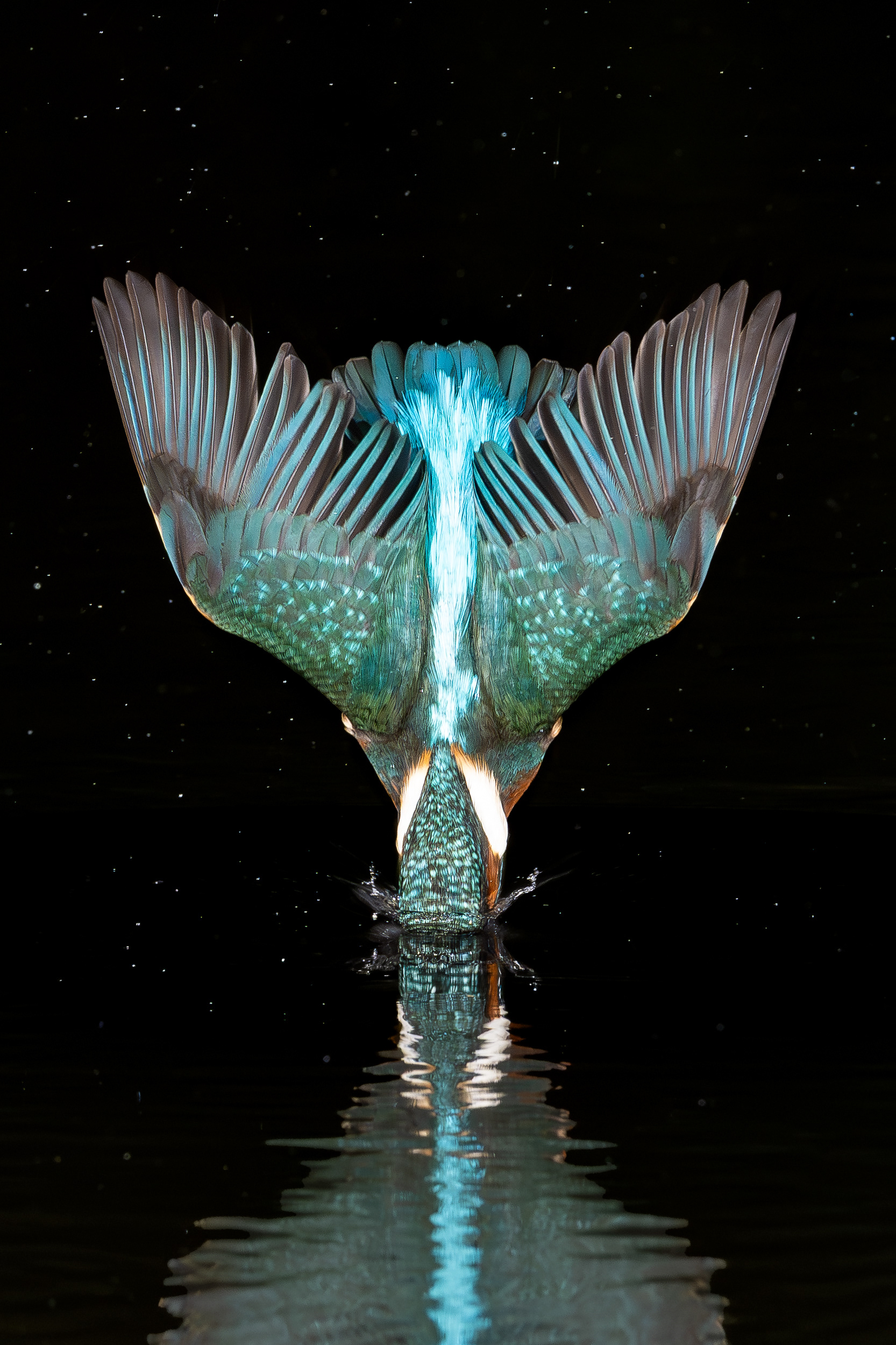 These images of Kingfishers were taken at Pete Whieldon's "Otterbourne Hides and Studio". Although they have the appearance of being taken at night, the background is dark because they were taken with flash as the only light source. The bright speckles in the images are raindrops.
