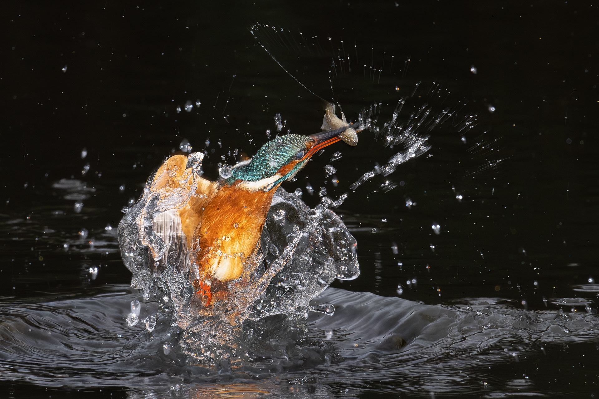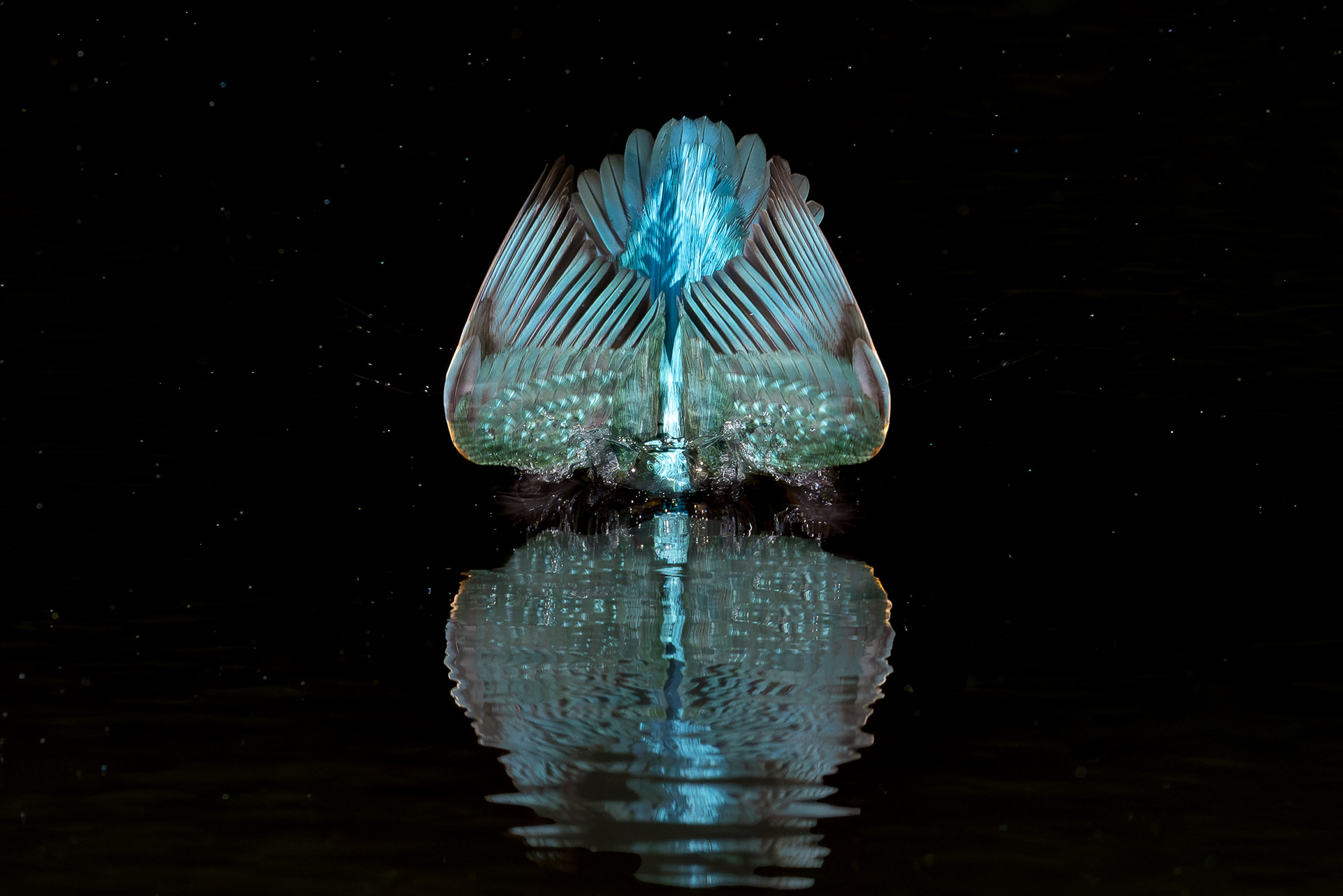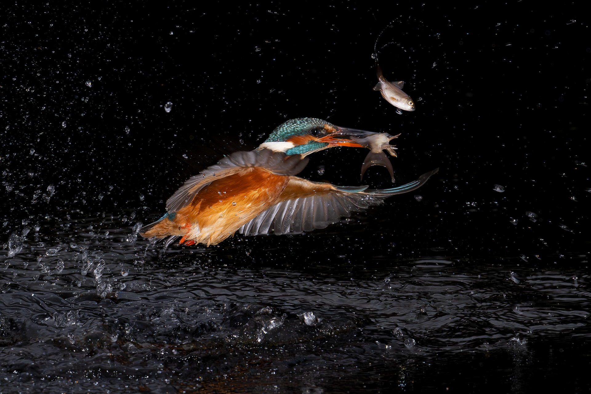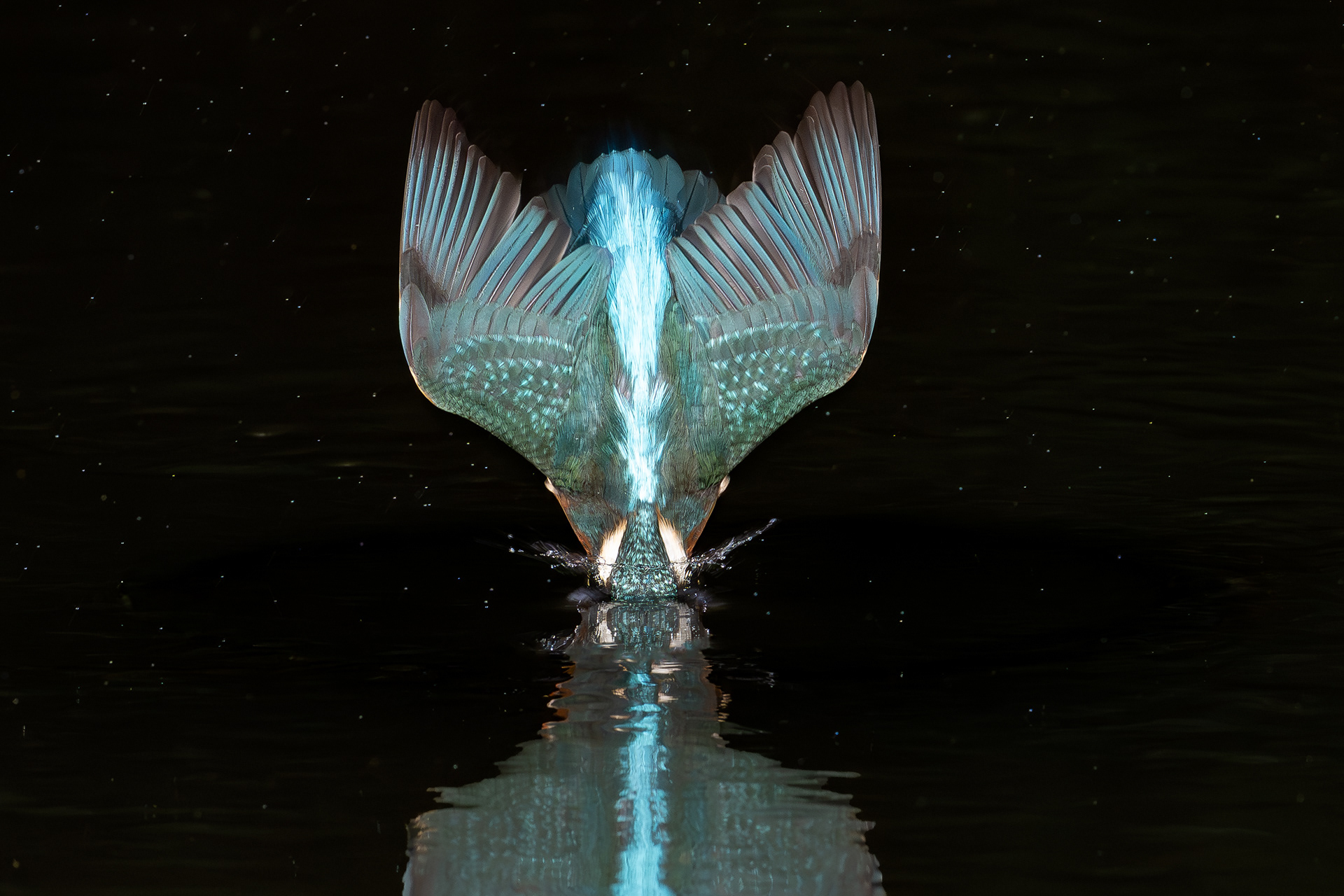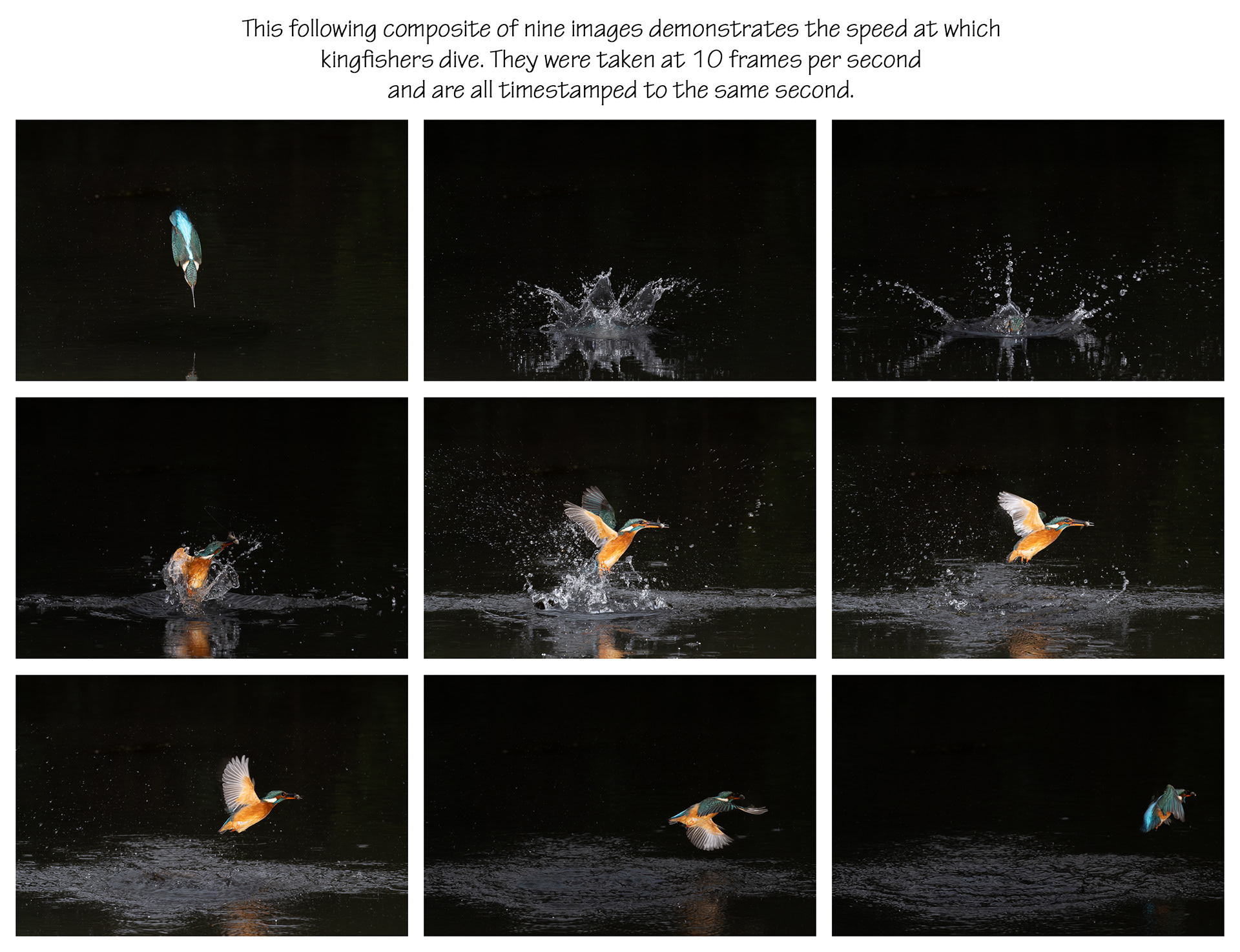 These images of Kingfishers were taken at Pete Whieldon's "Otterbourne Hides and Studio". Although they have the appearance of being taken at night, the background is dark because they were taken with flash as the only light source. The bright speckles in the images are raindrops.