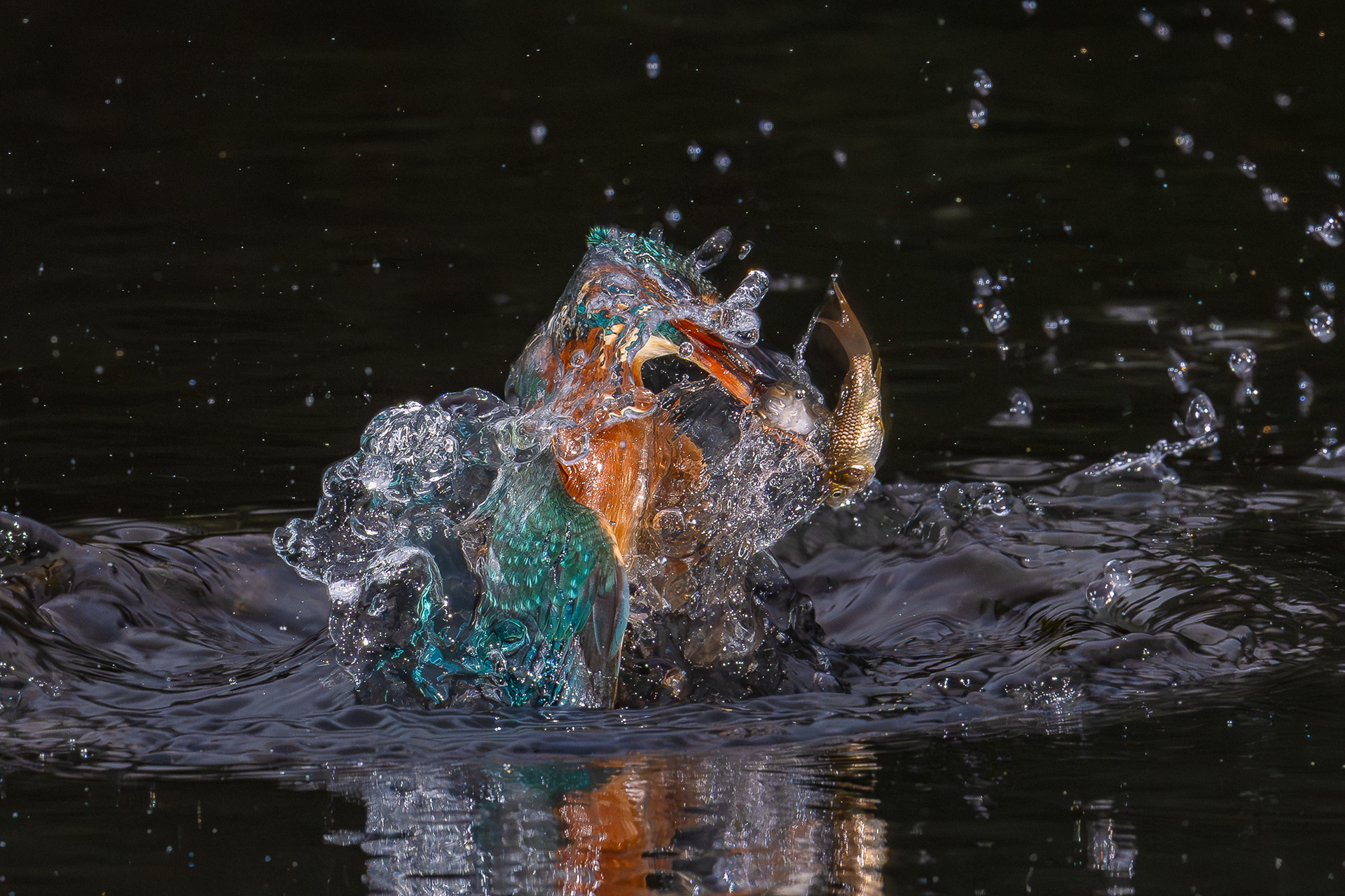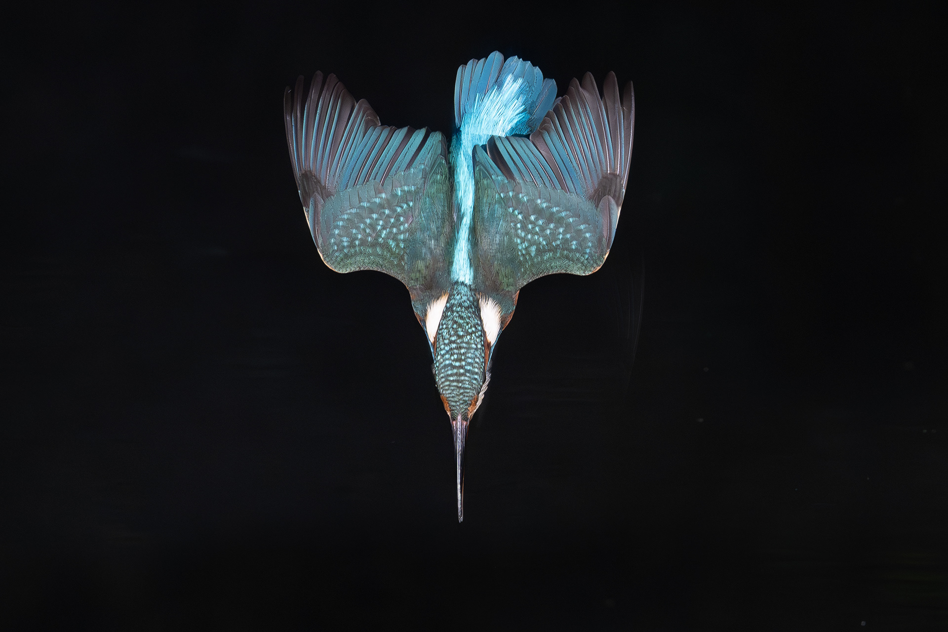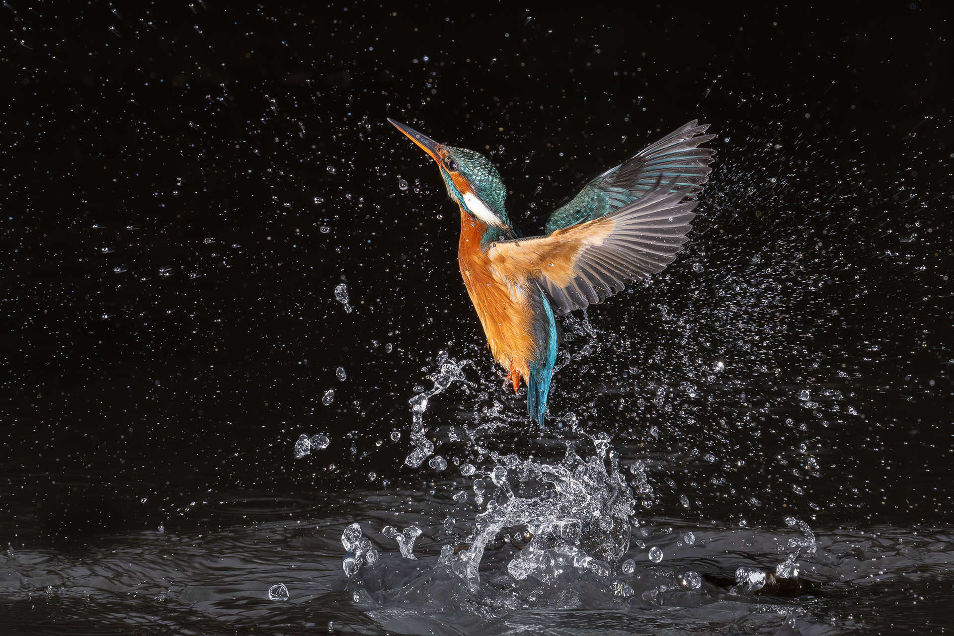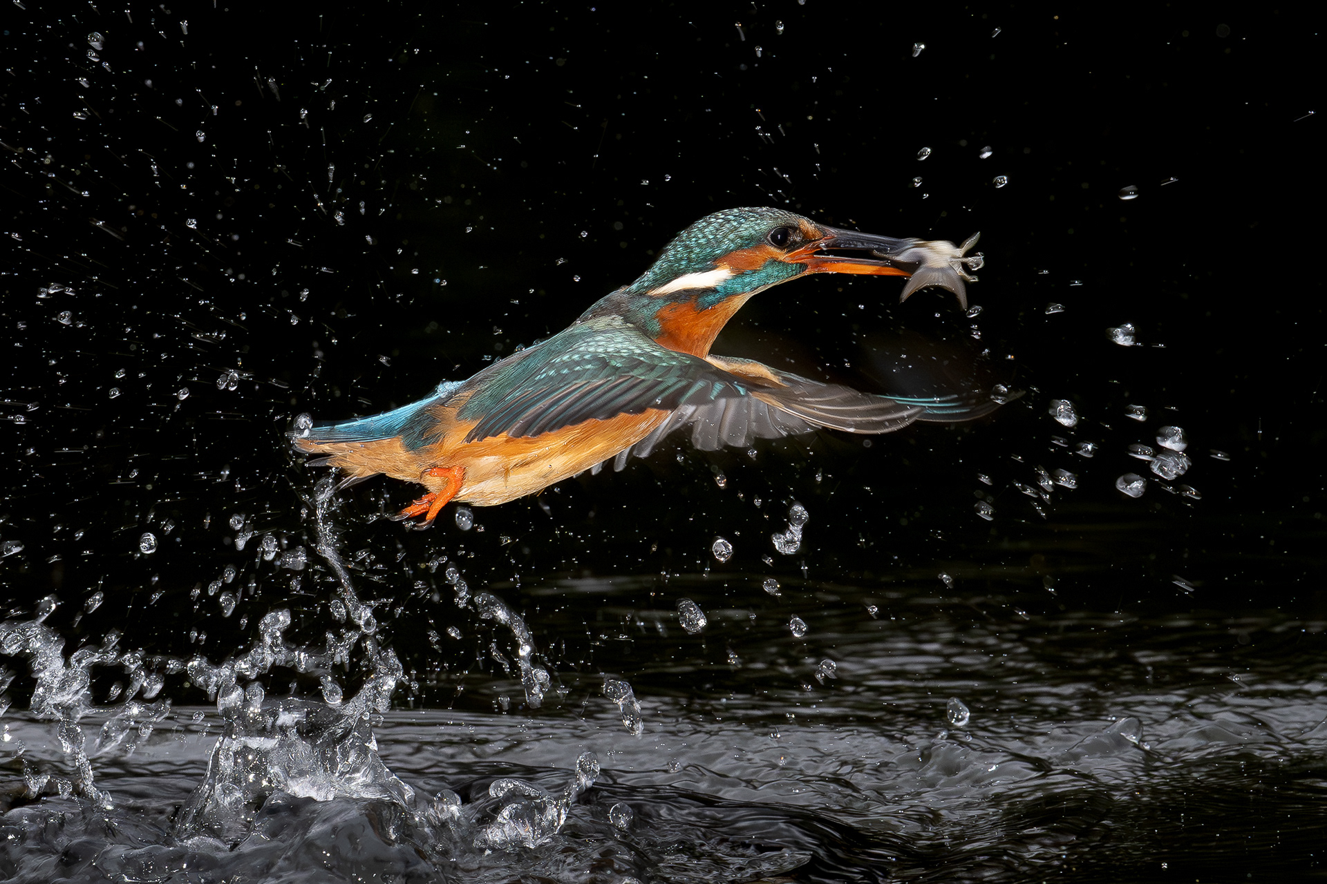 These images of Kingfishers were taken at Pete Whieldon's "Otterbourne Hides and Studio". Although they have the appearance of being taken at night, the background is dark because they were taken with flash as the only light source. The bright speckles in the images are raindrops.