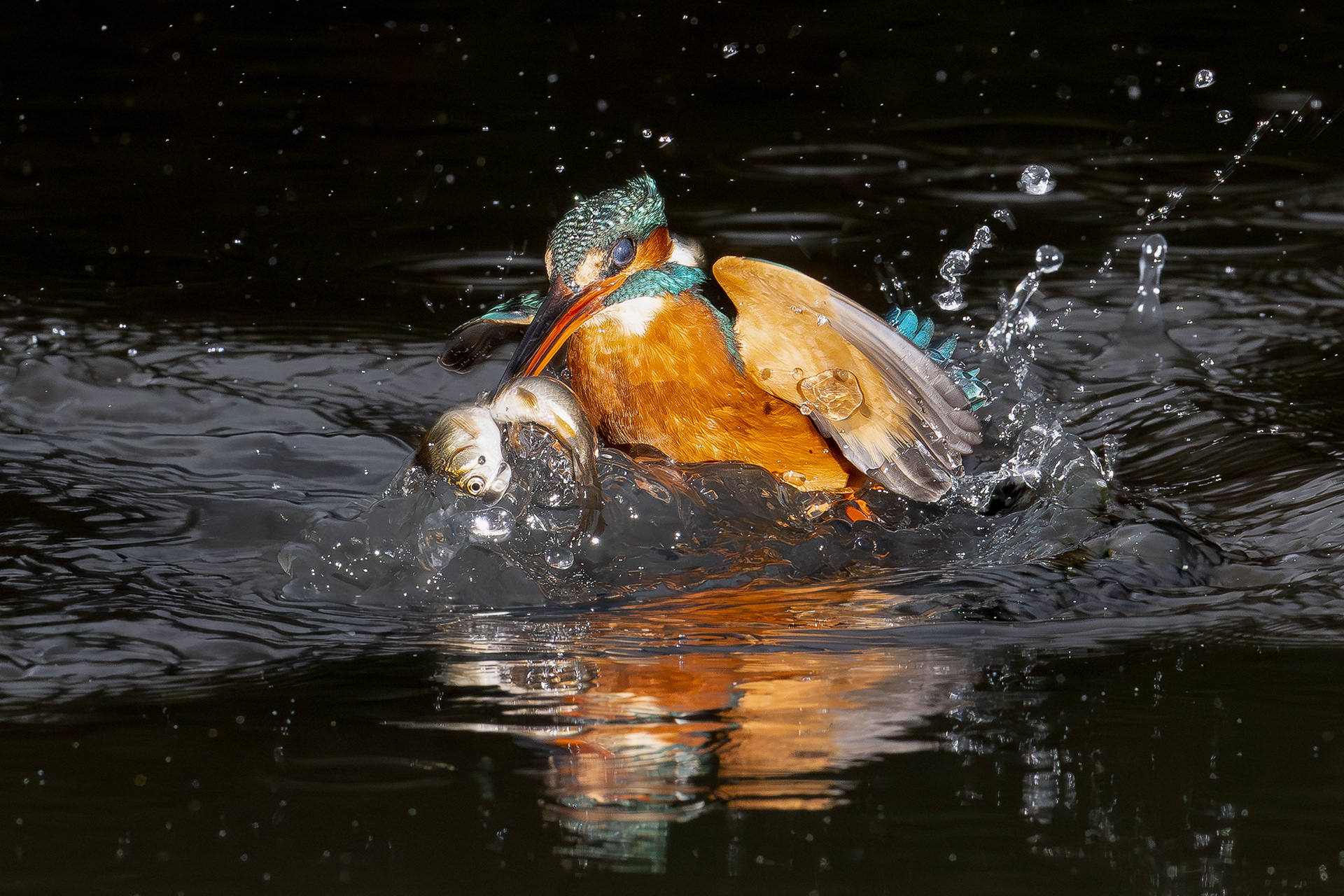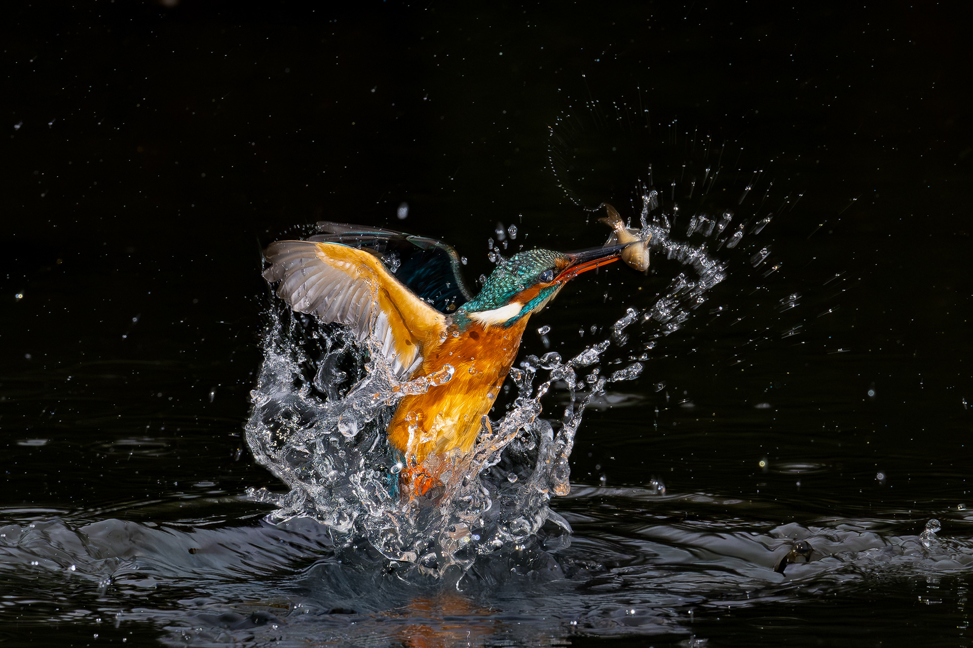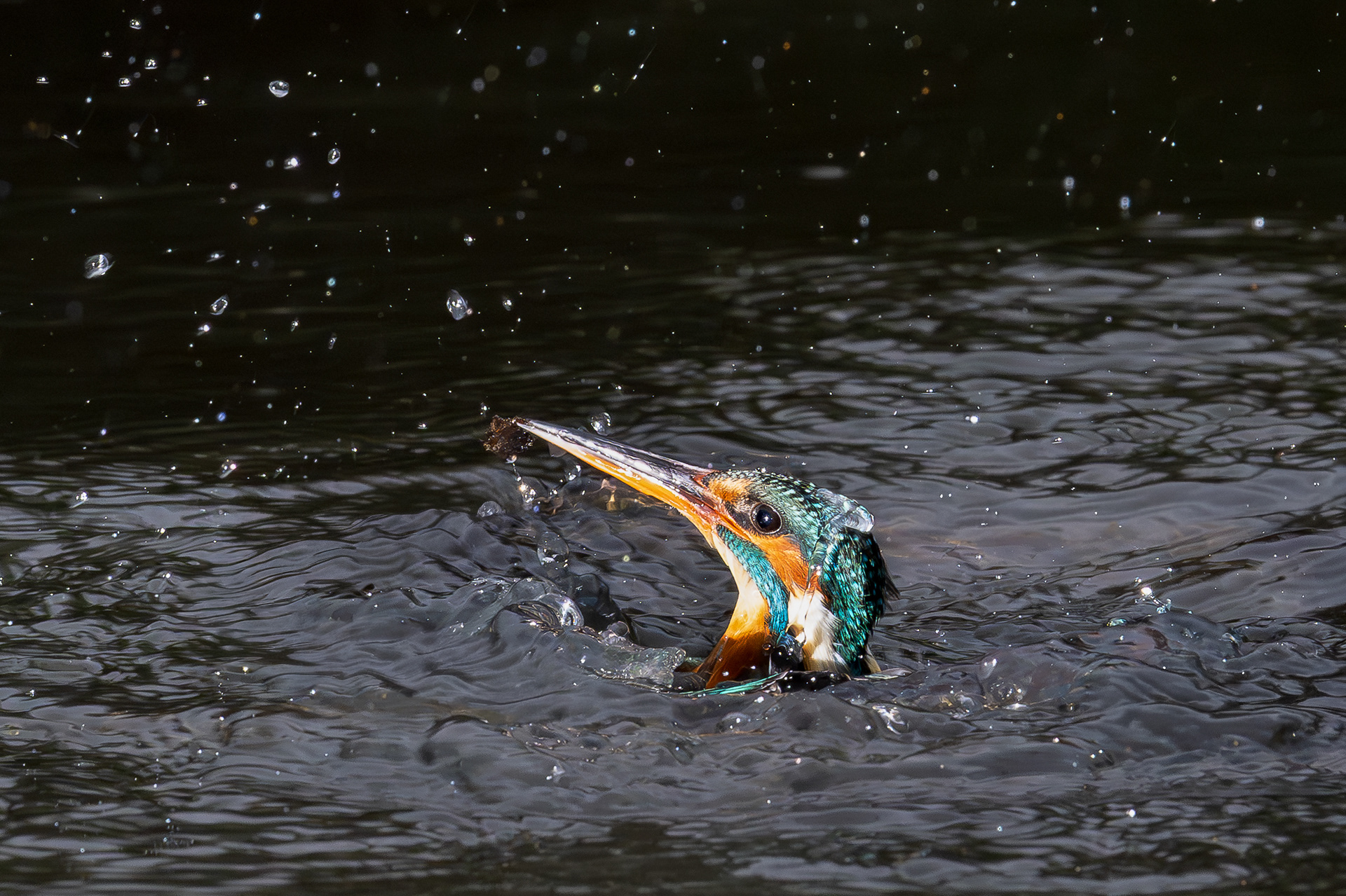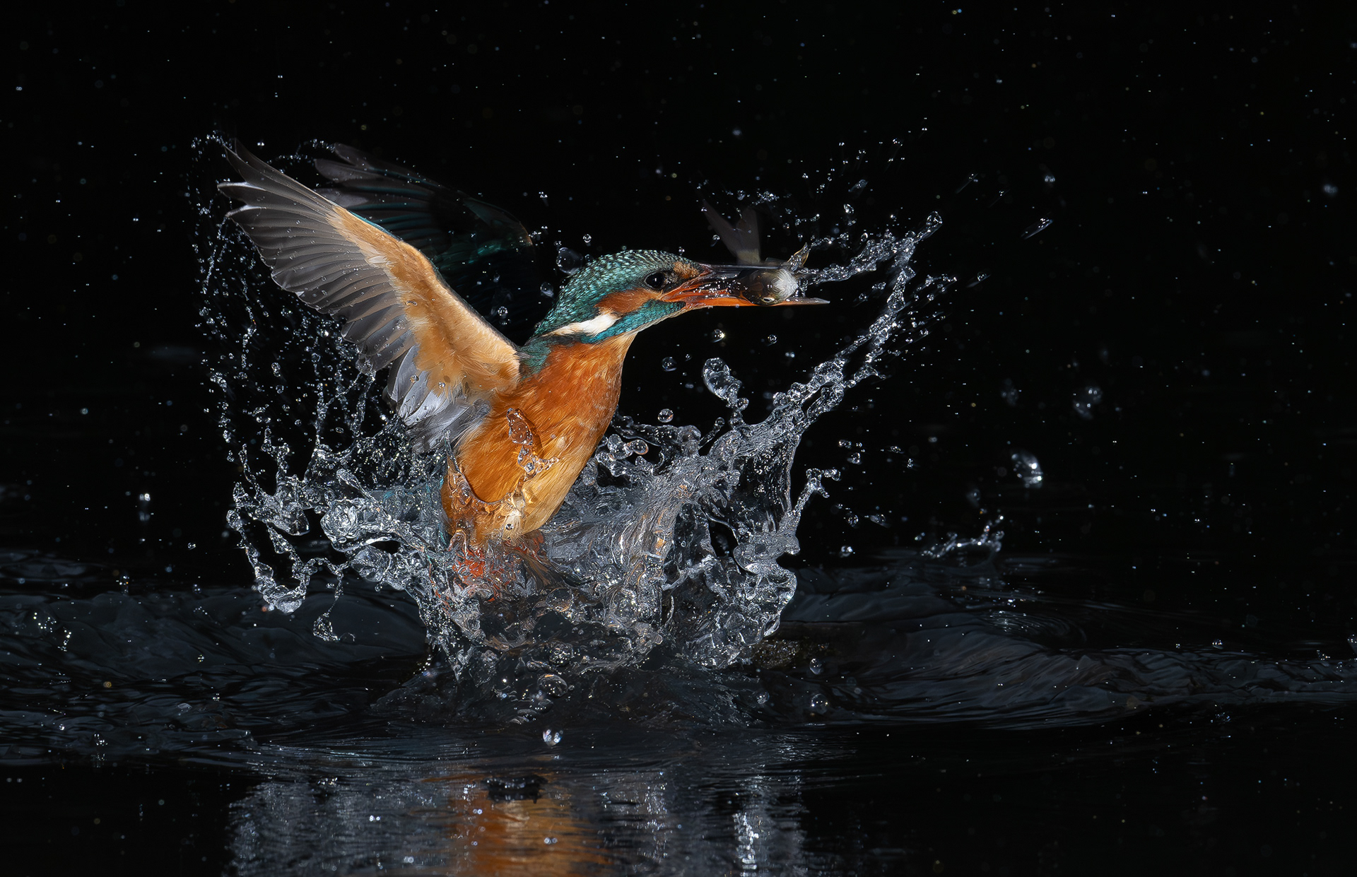 These images of Kingfishers were taken at Pete Whieldon's "Otterbourne Hides and Studio". Although they have the appearance of being taken at night, the background is dark because they were taken with flash as the only light source. The bright speckles in the images are raindrops.